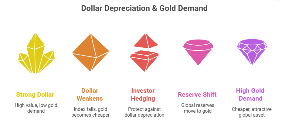 U.S. dollar relative depreciation is one of the major factors behind the gold rush. Gold being traded in dollars, the weaker the dollar, the cheaper it becomes to the foreign markets, and the more attractive it becomes in the home market. A recent review shows that there is a massive fall of the dollar index in 2025, a partial reason for the gold rush. A declining dollar in the United States tends to fuel the desire towards commodities and precious metals since these are more appealing forms of value. Investors who witness the devaluation of the greenback might choose to invest in gold instead of liquid cash or assets exchangeable in dollars.
