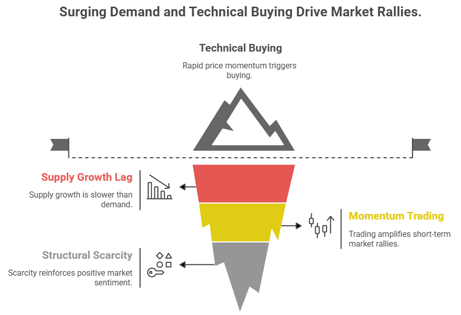 At the same time, money in the form of gold ETFs and physical gold has shot up and attracted retail and institutional funds. The institutional support and accumulation by the central bank lend the rally more stability than a strictly speculative one.